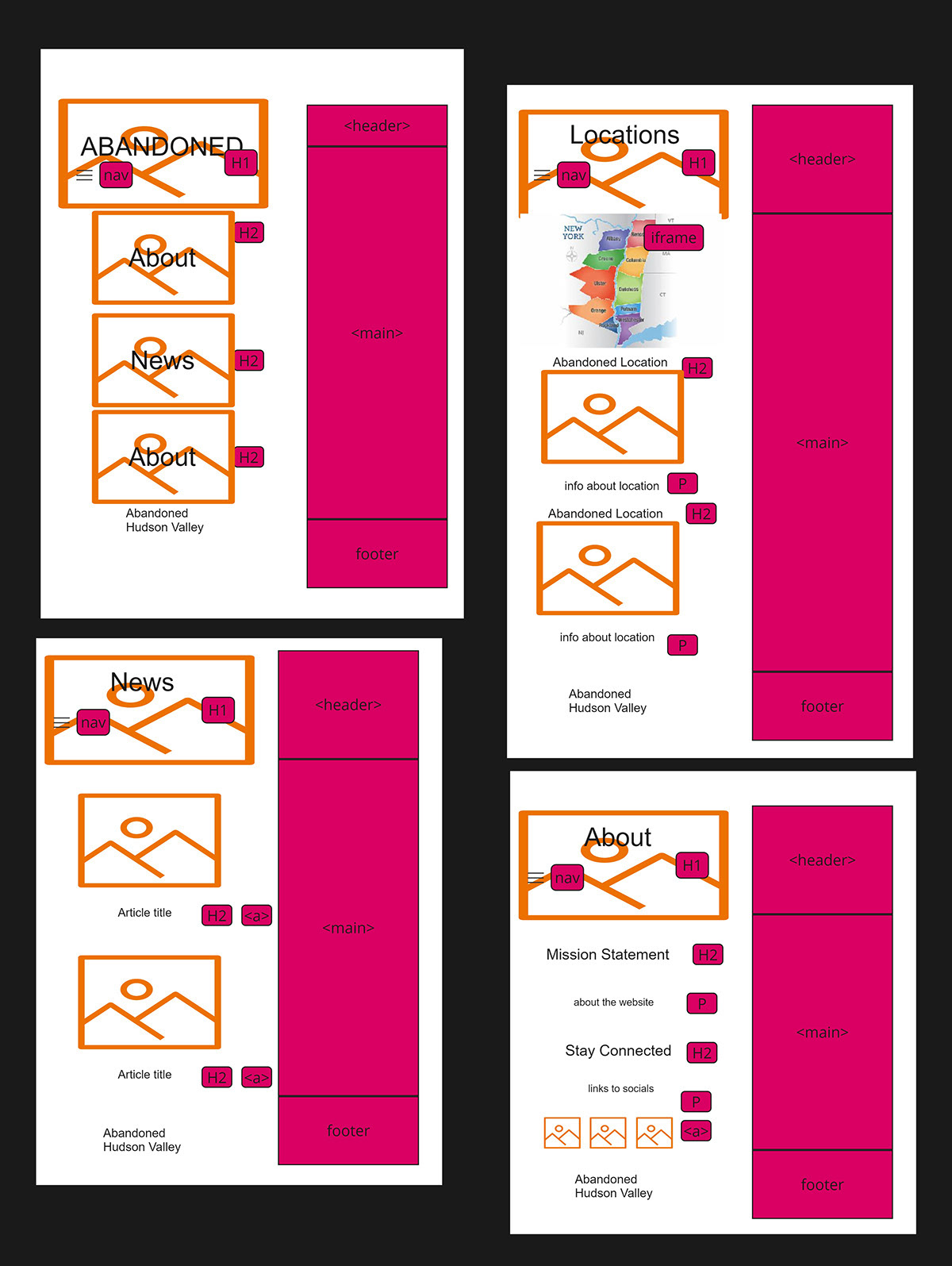 I changed my wireframes quite a bit from what they originally looked like. My original page included the iframe map and didn't have pictures for each H2, but in the end, it felt more fitting and cleaner to have the iframe on the locations page. I also think adding images to the home page helps to add more intrigue.