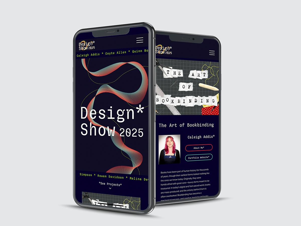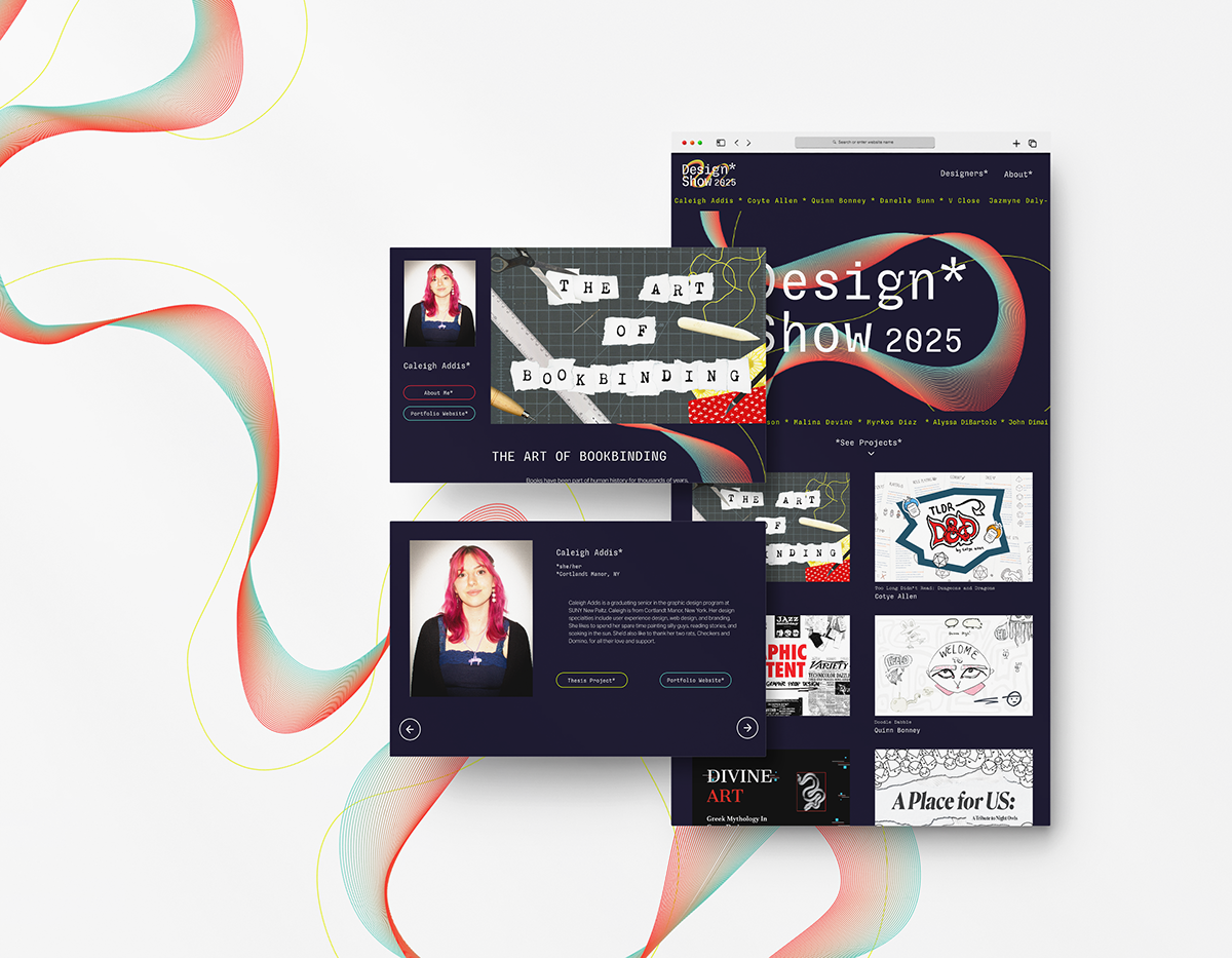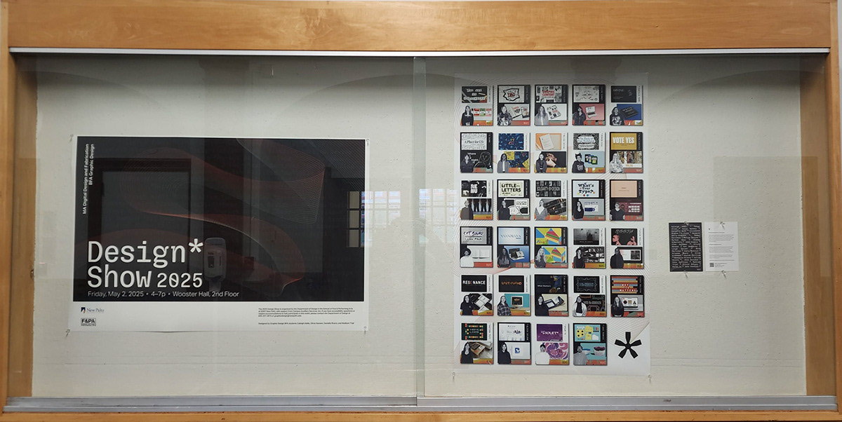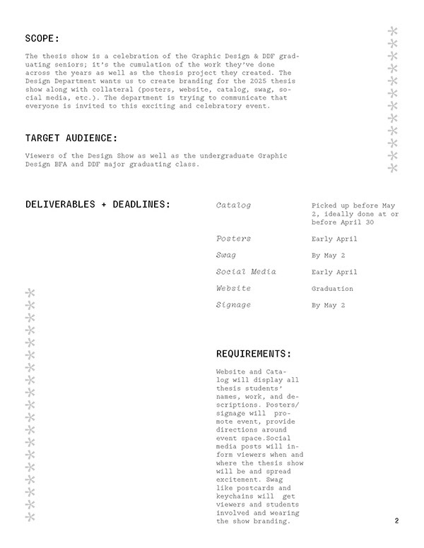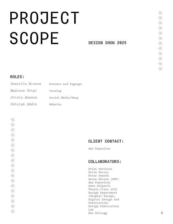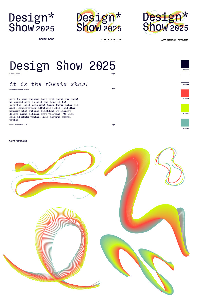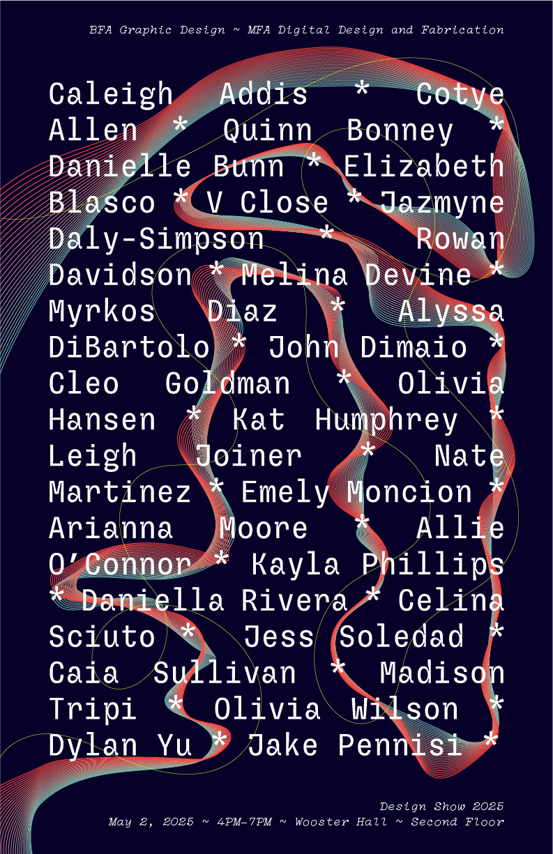 The Design Department entrusted a group of graphic design seniors to create branding for the 2025 thesis show, along with collateral (posters, website, catalog, swag, social media, etc.). The department is trying to communicate that everyone is invited to this exciting and celebratory event.